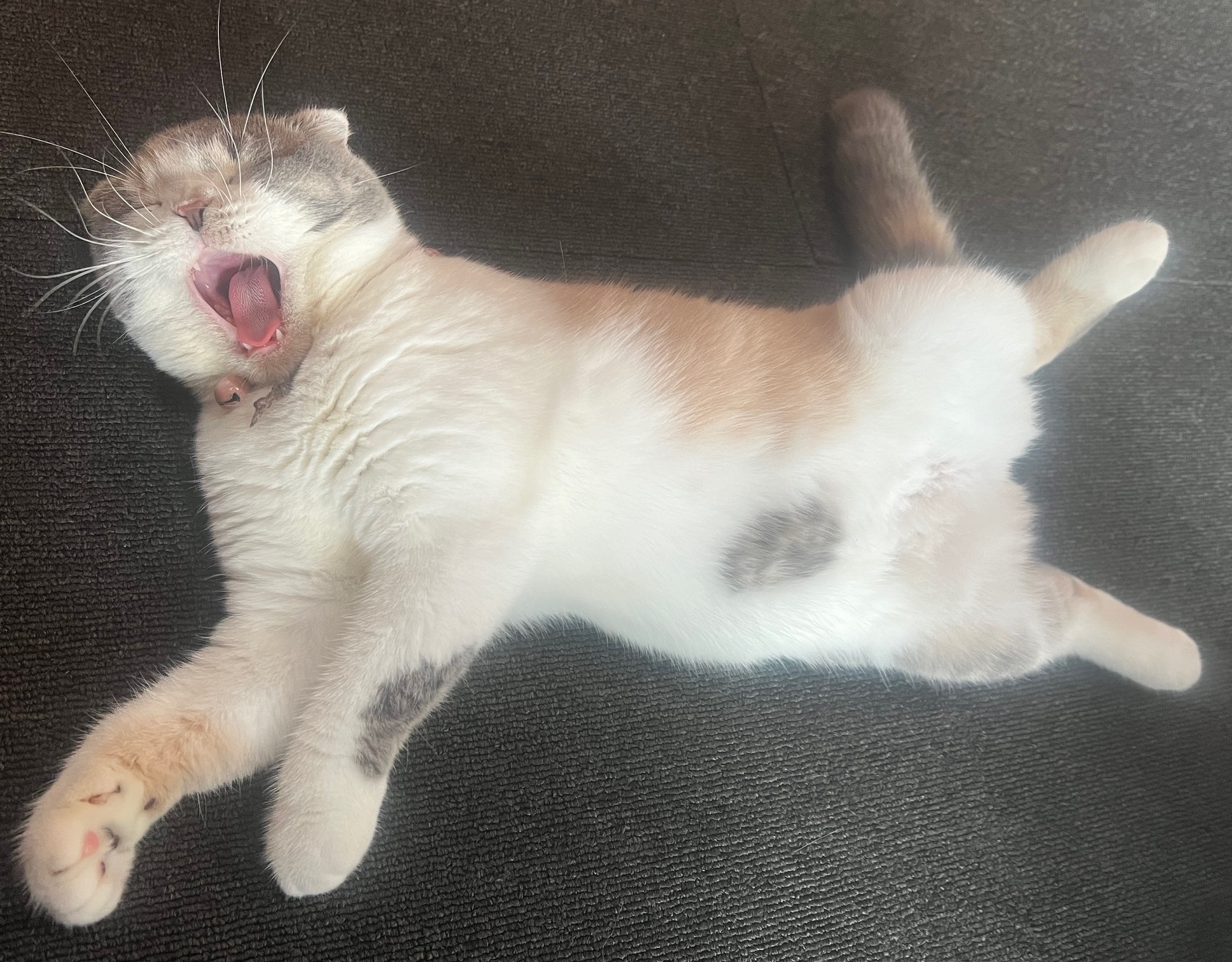 きなこちゃんあくびをしながらのへそ天です😾お腹のグレー🩶の丸が可愛いです☺️ ※10/16(水)11/3(日)会社都合によりお休みさせていただきます。よろしくお願い致します🙇